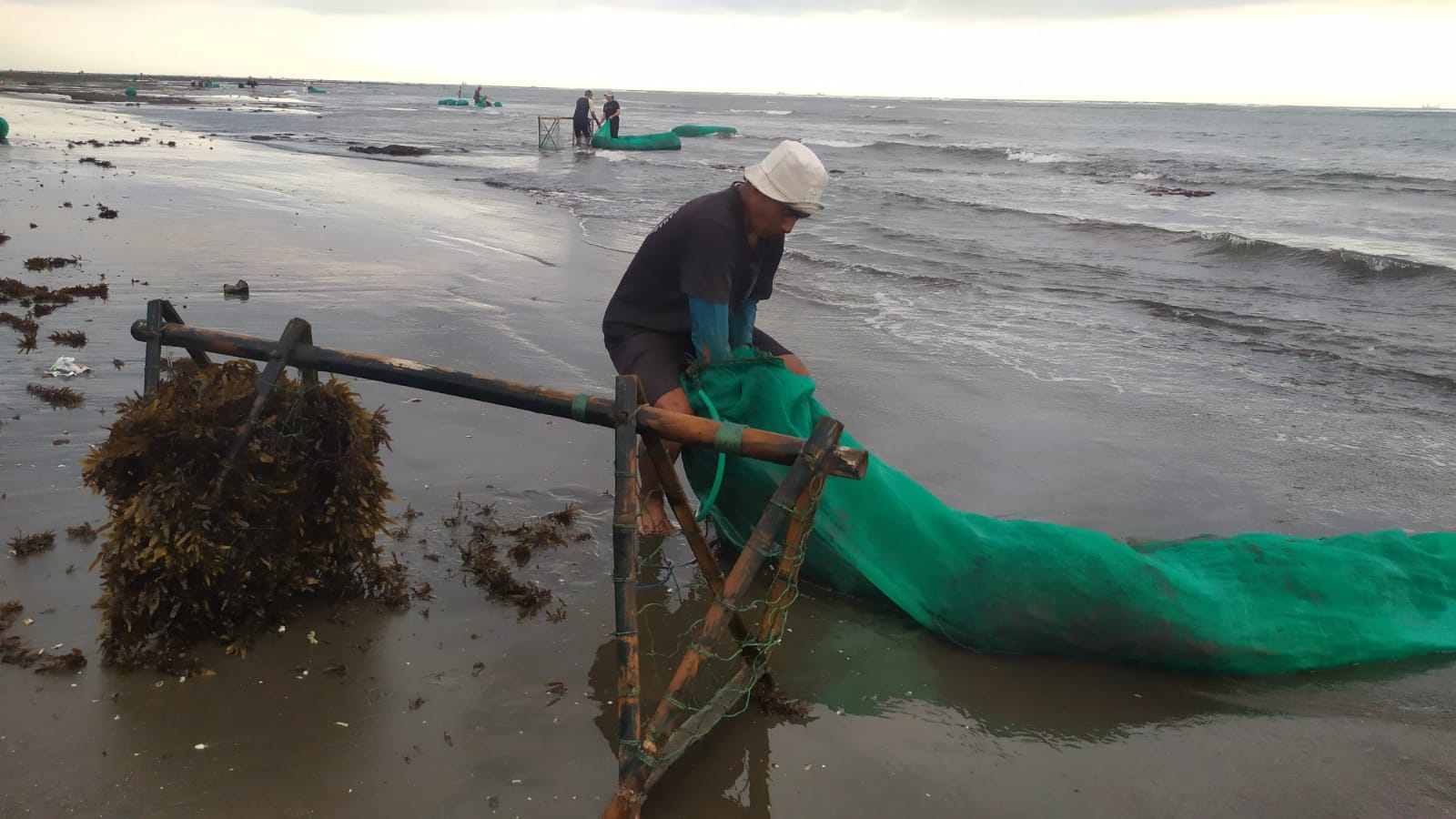 “Biasanya kami keringkan dulu selama setengah atau satu hari, tergantung cuaca. Ada pengepulnya yang ambil. Katanya dikirim ke Jawa untuk membuat kosmetik,” tutur Nengah Suarjana, warga Perancak yang mengambil rumput laut dengan jaring.