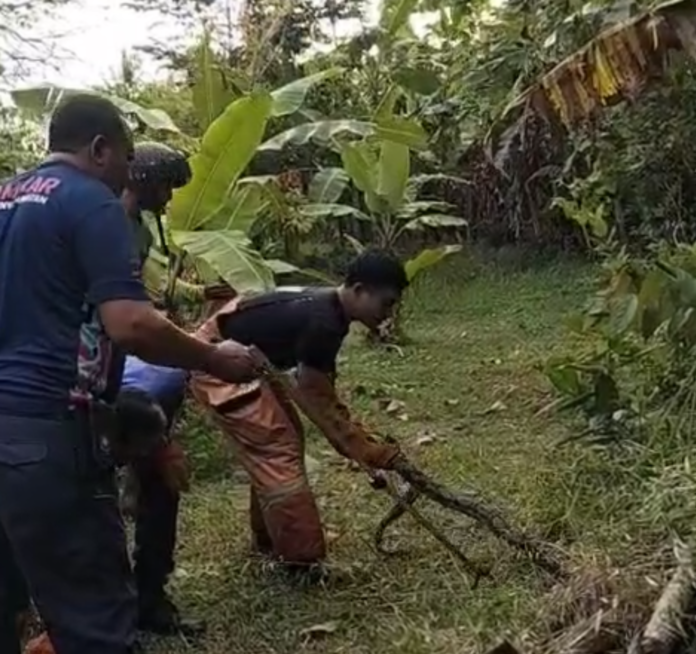 Petugas Pemadam Kebakaran dan Penyelamatan Kabupaten Jembrana berhasil mengevakuasi seekor ular sanca sepanjang dua meter yang ditemukan di Desa Kaliakah, Kecamatan Negara, pada Jumat 19 September 2025. Sumber foto : istimewa /IJN.