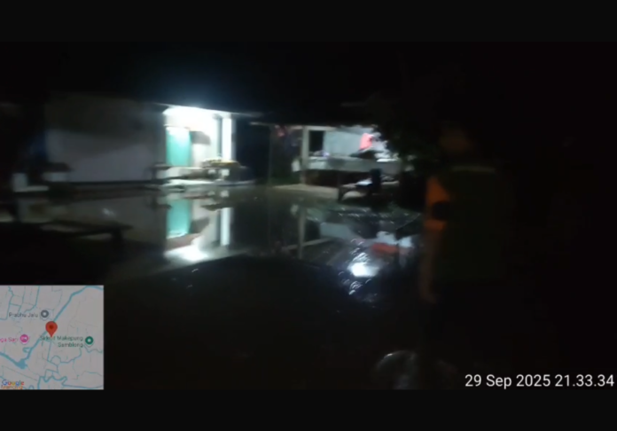 Petugas BPBD Jembrana melakukan pengecekan dan evakuasi, akibat sungai Samblong, Kelurahan Sangkaragung, Jembrana meluap dan menggenangi rumah warga, Senin malam 29 September 2025. Sumber foto : istimewa /IJN.
