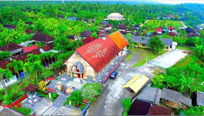 Gereja Santa Maria Ratu nampak atas cukup indah. Gereja ini berada di Desa Gumbrih Kecamatan Pekutatan, Kabupaten Jembrana.