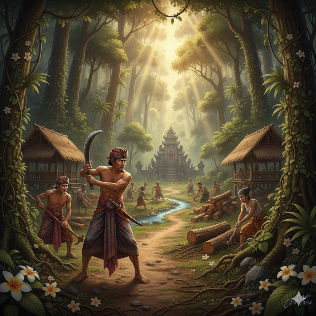 Ilustrasi masyarakat membuka hutan mendirikan Desa Pekutatan.