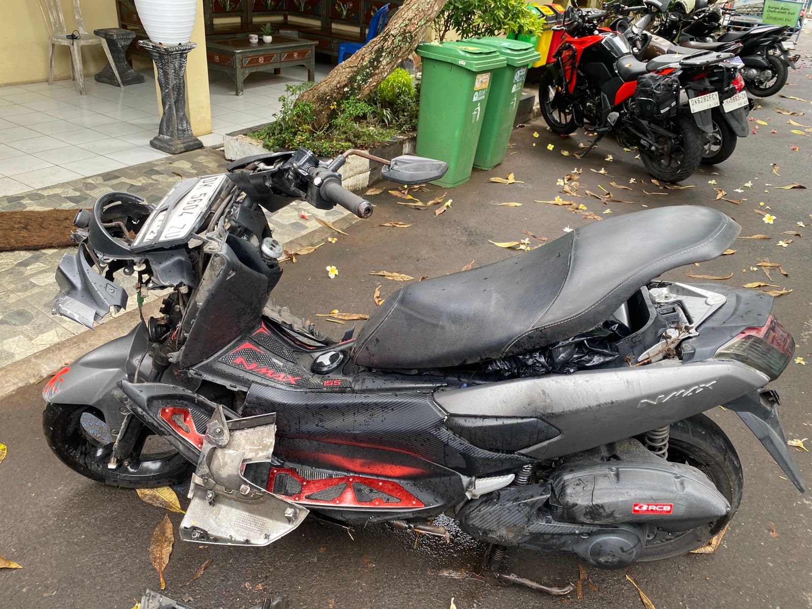 Kondisi sepeda motor korban setelah alami kecelakaan lalu lintas beruntun yang melibatkan tiga kendaraan terjadi di jalur Denpasar-Gilimanuk, Desa Dangin Tukadaya, Kecamatan Jembrana, Sabtu malam 8 November 2025. Sumber foto : Istimewa/IJN.