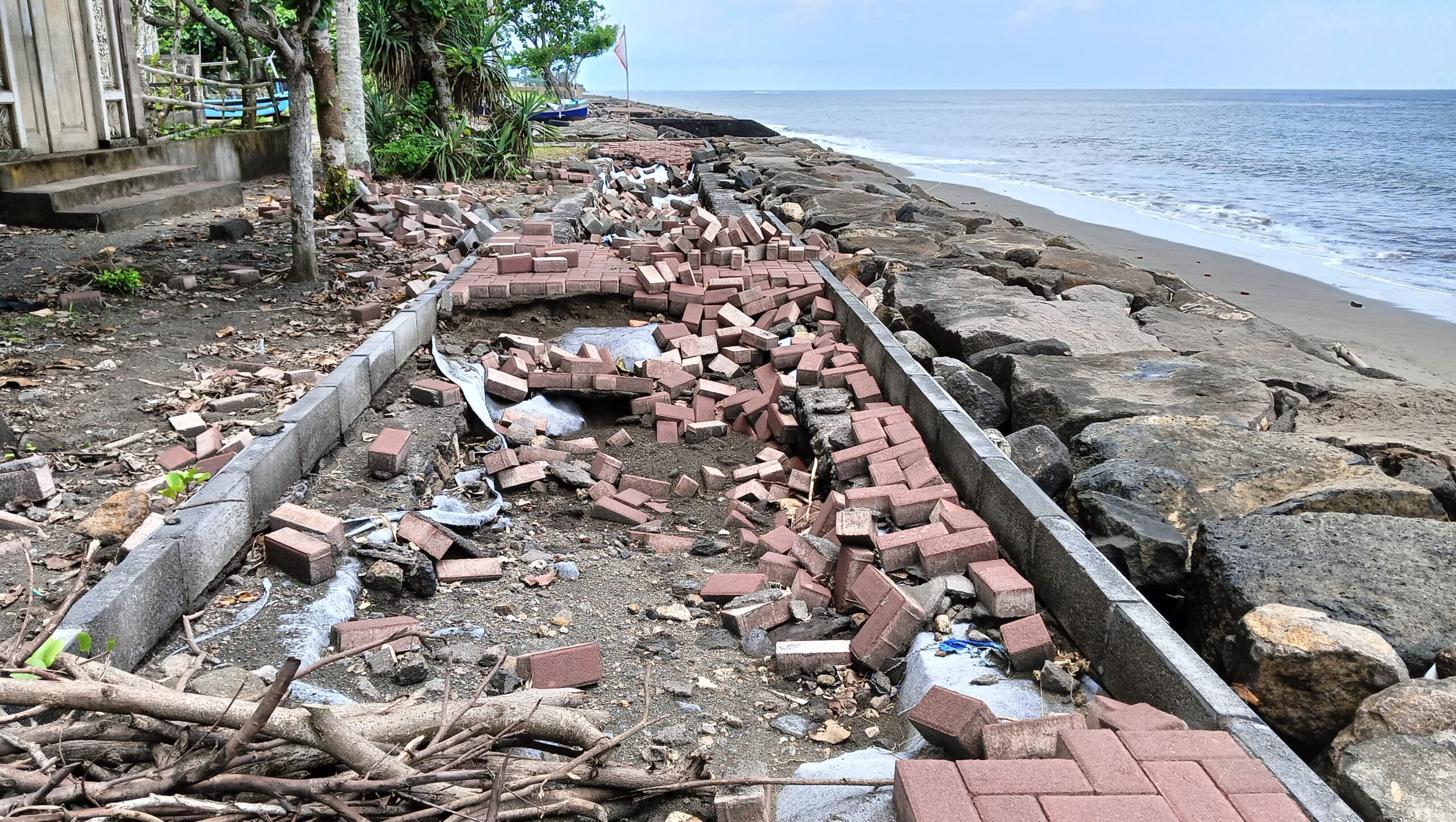 Paving blok yang berada di atas bangunan utama revetment (dinding penahan ombak) dan berfungsi sebagai jalan setapak pencegah abrasi tersebut kini tak lagi utuh. Menurut keterangan warga setempat, Wayan Denda dari Banjar Mekarsari, Desa Perancak, kerusakan terjadi di dua sisi.