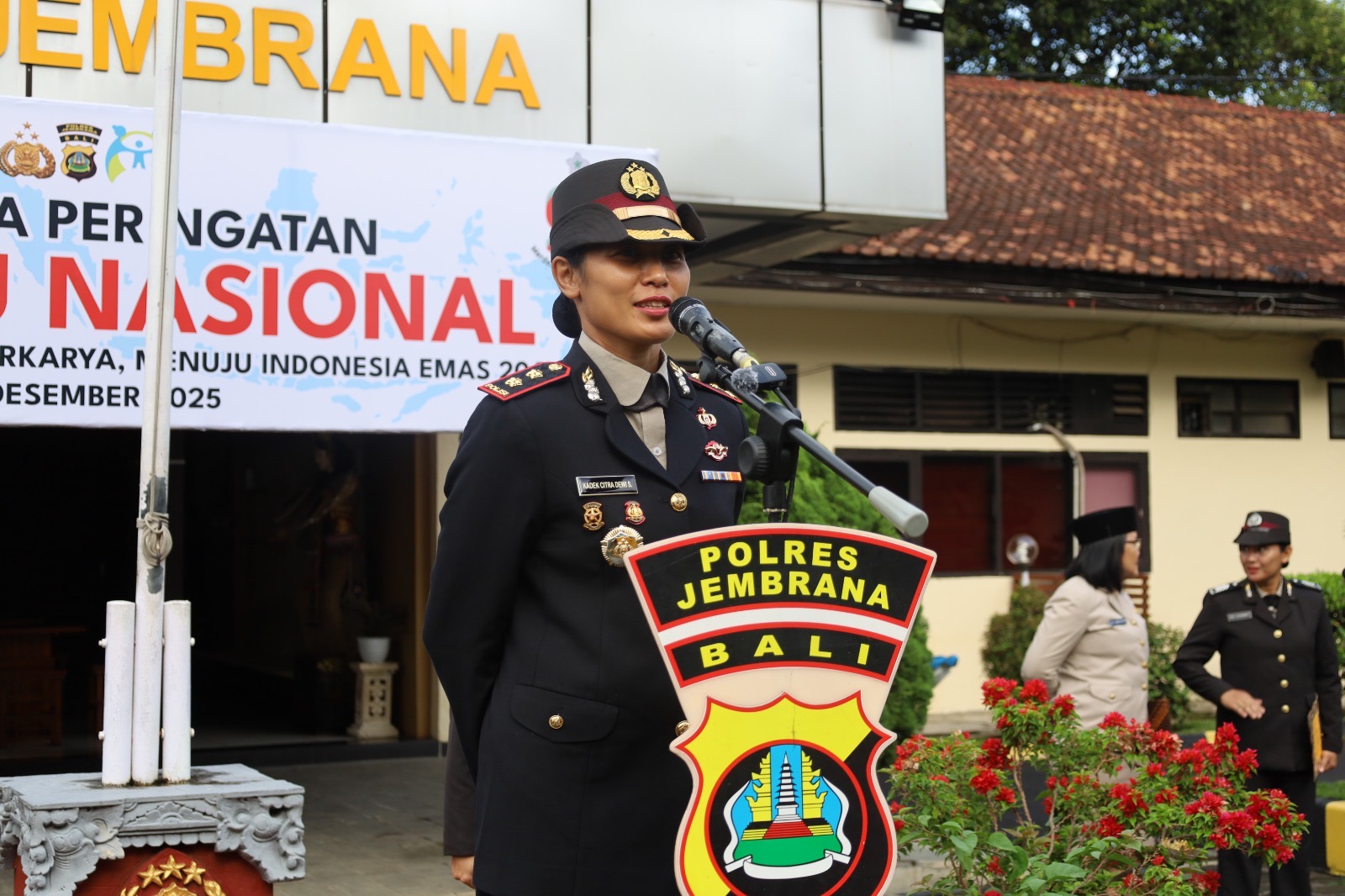 Dalam upacara yang mengusung tema “Perempuan Berdaya dan Berkarya, Menuju Indonesia Emas 2045” ini, seluruh posisi strategis upacara diisi oleh personel perempuan. IPDA Ni Ketut Wartini bertindak sebagai Komandan Upacara dan AKP Ni Made Srianti sebagai Perwira Upacara, menunjukkan nyata peran aktif perempuan di lini depan kepolisian.