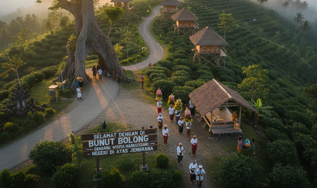 Di perbatasan bukit Jembrana, sebuah pohon Bunut tua dengan lubang alami di tengah batangnya berdiri tegak, seolah menjadi gerbang mistis yang memisahkan hiruk-pikuk dunia dengan keasrian perbukitan. Inilah Bunut Bolong, ikon Wisata Bali Barat yang bukan sekadar objek foto, melainkan penjaga spiritual Desa Manggissari yang siap menyambut Anda dengan aura ketenangan yang mendalam.