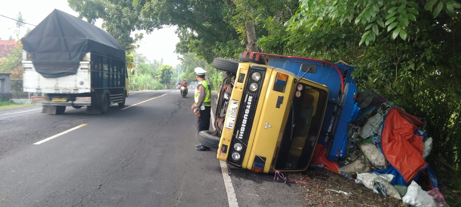 ”Truk bergerak dari arah timur (Denpasar) menuju barat (Gilimanuk). Saat melintasi jalan lurus yang bergelombang, kendaraan mengalami oleng ke kiri dan akhirnya terguling di bahu jalan,” ujar Iptu Aldri Setiawan.