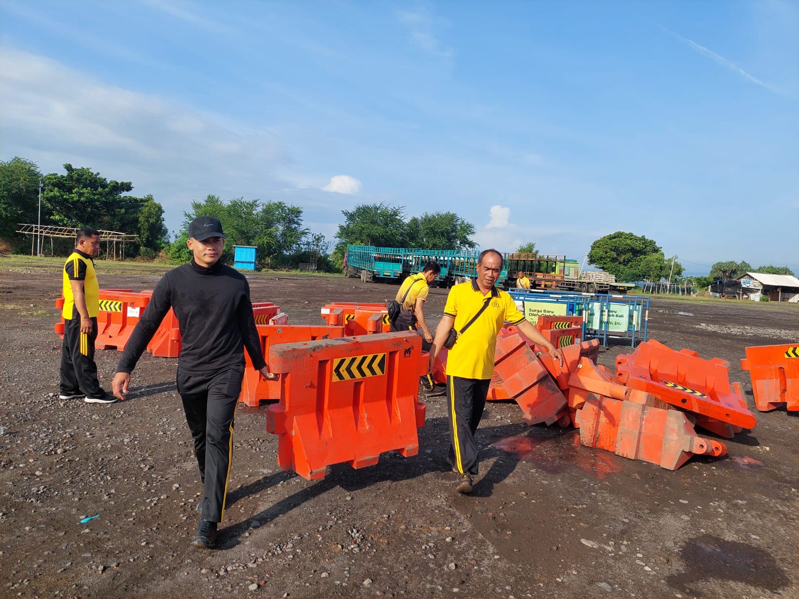 Petugas dari Polres Jembrana melakukan pemasangan water barrier dan gotong royong pembersihan areal Terminal Kargo menjelang arus mudik Lebaran, Selasa 10 Maret 2026. Sumber foto : Ist/IJN.