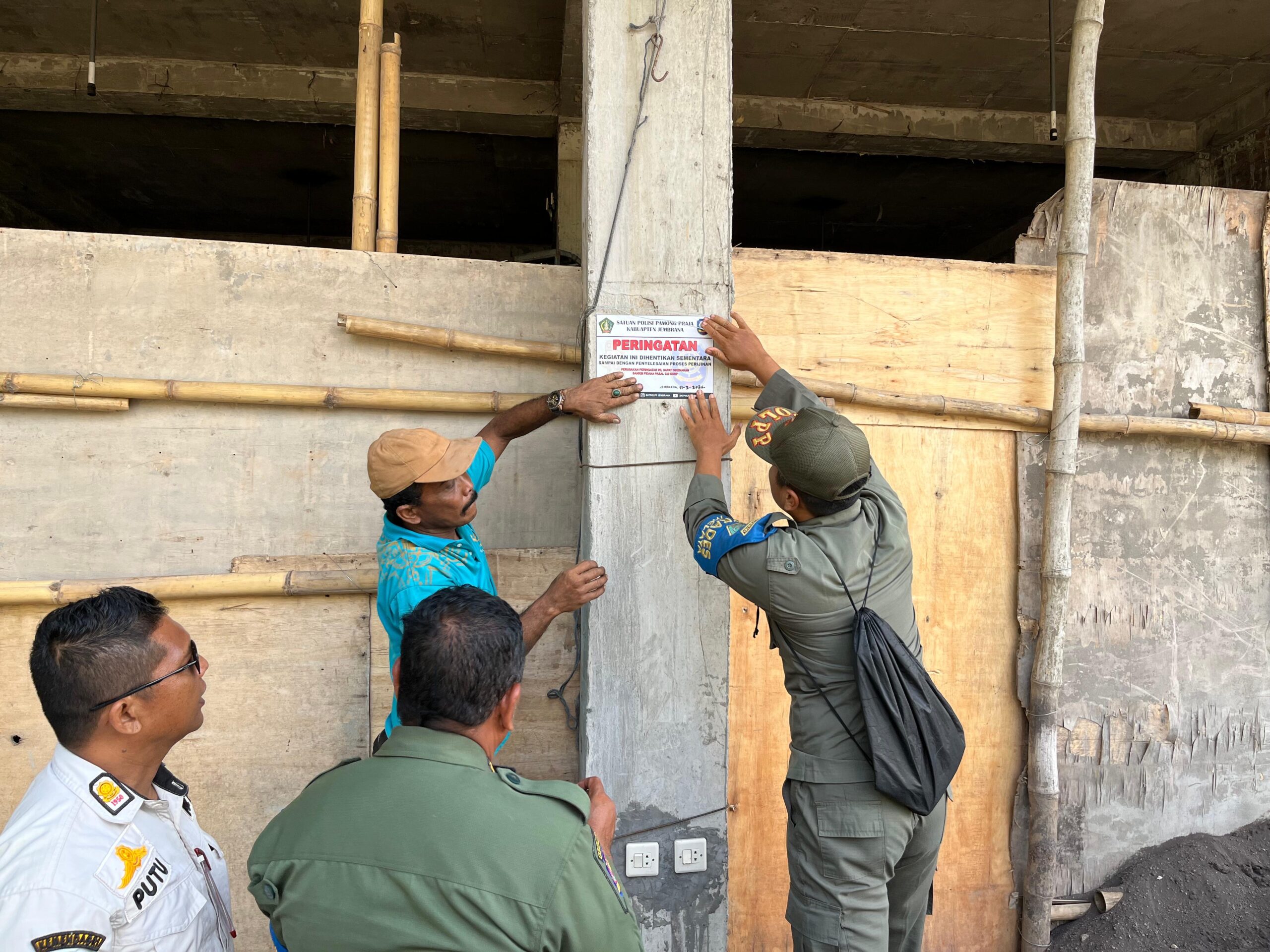 Petugas dari Satpol PP Jembrana, melakukan penyegelan dengan pemasangan stiker penghentian kegiatan terhadap bangunan yang belum memiliki ijin di Kecamatan Melaya, pada Rabu 11 Maret 2026. Sumber foto : Ist/IJN.