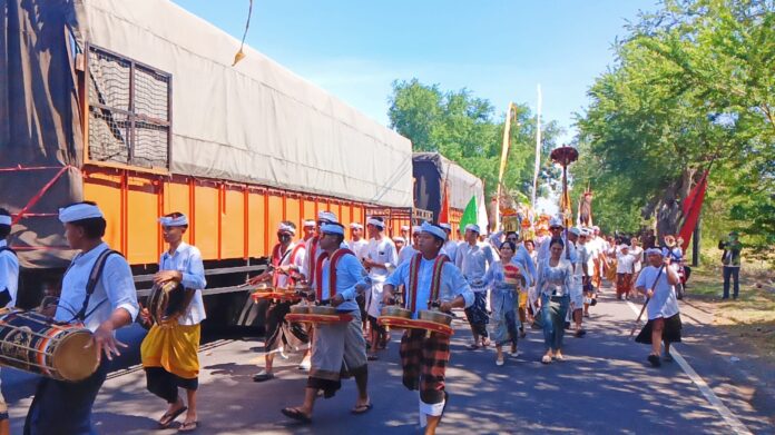 Di tengah ribuan kendaraan pemudik yang mengular panjang, iring-iringan warga Desa Adat Gilimanuk tetap khidmat melaksanakan prosesi Melasti menjelang Hari Suci Nyepi, pada Senin 16 Maret 2026. Sumber foto : CAK/IJN.